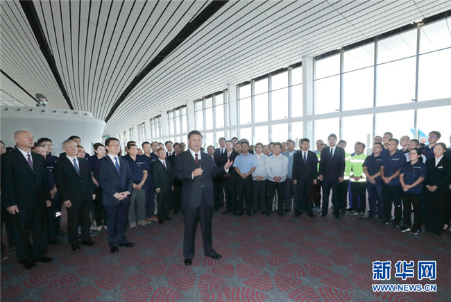 大興機(jī)場(chǎng)航站樓,是目前全球最大規(guī)模的單體航站樓,以其獨(dú)特的造型設(shè)計(jì)、精湛的施工工藝、便捷的交通組織、先進(jìn)的技術(shù)應(yīng)用,創(chuàng)造了許多世界之最。航站樓里,流線型的空間結(jié)構(gòu)十分寬敞明亮。習(xí)近平步行巡覽站臺(tái)大廳和值機(jī)大廳,實(shí)地了解值機(jī)、安檢、登機(jī)和殘疾人無障礙設(shè)施等情況,并結(jié)合沙盤和模型聽取機(jī)場(chǎng)總體規(guī)劃、設(shè)施建設(shè)等介紹。習(xí)近平強(qiáng)調(diào),大興國(guó)際機(jī)場(chǎng)是首都的重大標(biāo)志性工程,是推動(dòng)京津冀協(xié)同發(fā)展的骨干工程。京津冀三地要抓住機(jī)遇加強(qiáng)協(xié)同合作,加快推動(dòng)地區(qū)高質(zhì)量發(fā)展。民航業(yè)是國(guó)家重要的戰(zhàn)略產(chǎn)業(yè)。要建設(shè)更多更先進(jìn)的航空樞紐、更完善的綜合交通運(yùn)輸系統(tǒng),加快建設(shè)交通強(qiáng)國(guó)。