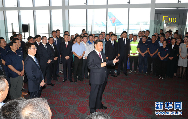 投運(yùn)儀式在機(jī)場(chǎng)聯(lián)檢大廳舉行。11時(shí)許,伴隨著歡快的迎賓曲,習(xí)近平等步入儀式現(xiàn)場(chǎng),全場(chǎng)起立鼓掌。