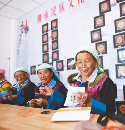 互助縣班彥新村村民在盤繡園內(nèi)制作盤繡。攝于2019年9月。新華社記者 張宏祥攝