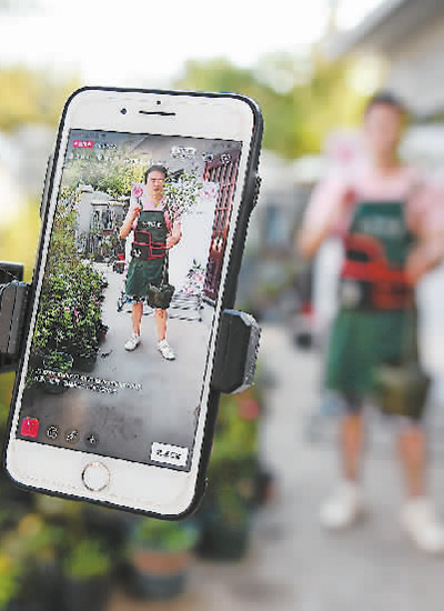 江蘇省宿遷市沭陽(yáng)縣,一名花農(nóng)正在家門口直播銷售月季花。 新華社記者 李 響攝