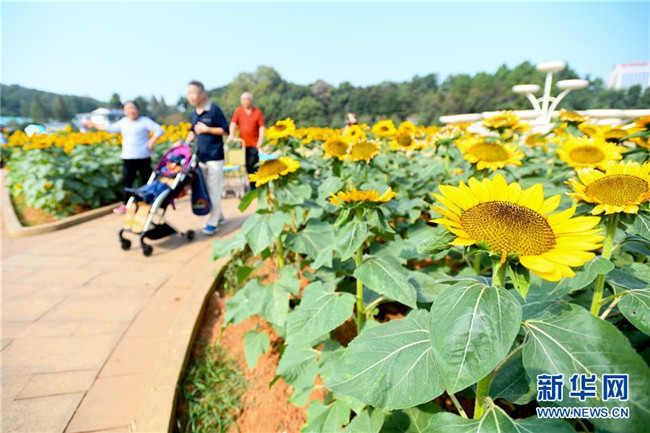 近日,位于長(zhǎng)沙市的湖南省森林植物園中的向日葵在秋陽(yáng)下競(jìng)相綻放,黃花綠葉交相輝映,吸引眾多市民、游客前來(lái)觀賞。
