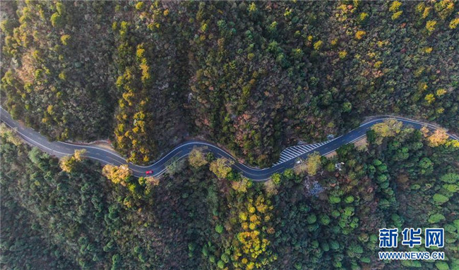 車輛行駛在通往廬山風景區(qū)的北山公路上(10月9日無人機拍攝)。新華社記者 胡晨歡 攝
