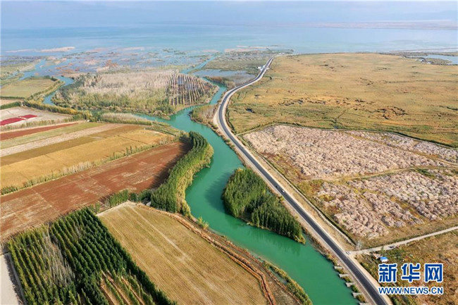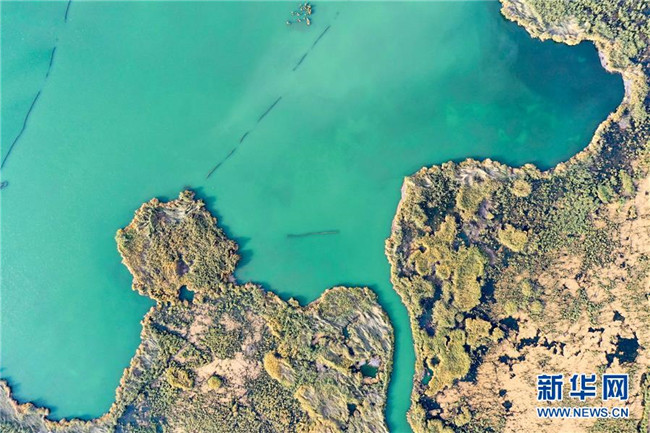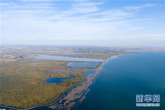 這是新疆博斯騰湖美景(10月12日無人機拍攝)。入秋以來,新疆博斯騰湖碧波蕩漾,美景如畫,吸引各地游客前來游玩。新華社記者丁磊攝