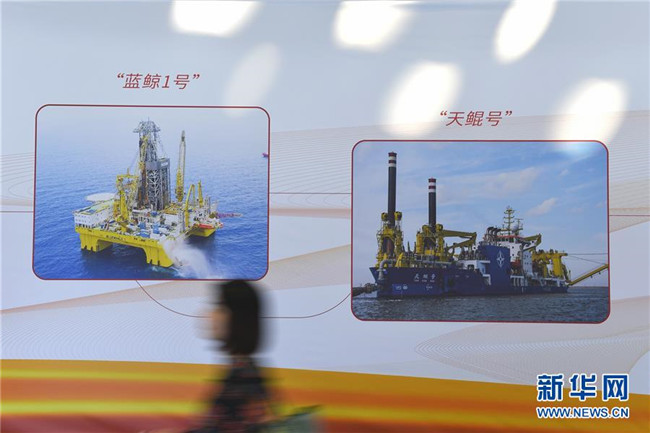 10月15日,與會(huì)者經(jīng)過“藍(lán)鯨1號(hào)”鉆井平臺(tái)與“天鯤號(hào)”自航絞吸挖泥船展板。 新華社記者毛思倩攝