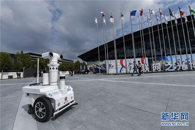 這是互聯(lián)網(wǎng)之光博覽會場館外巡邏的5G警用機器人(10月18日攝)。 新華社記者 徐昱 攝