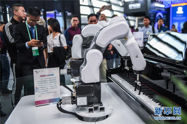 這是互聯(lián)網(wǎng)之光博覽會現(xiàn)場展示的能彈鋼琴的5G機器人(10月18日攝)。 新華社記者 徐昱 攝