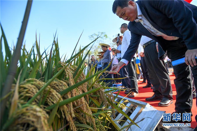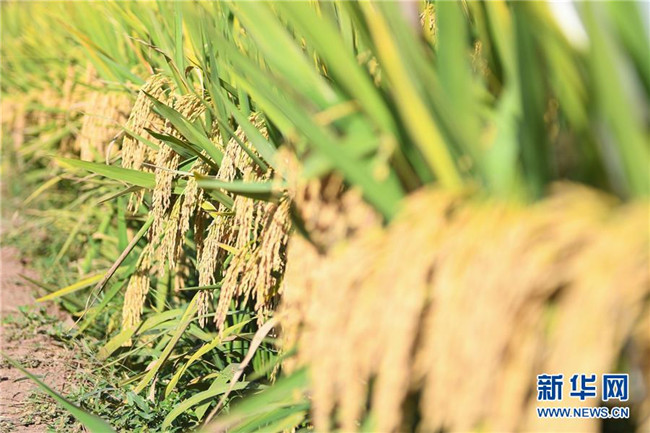這是第三代雜交水稻新組合試驗(yàn)示范衡南基地測(cè)產(chǎn)現(xiàn)場(chǎng)待收割的水稻(10月21日攝)。 新華社記者 陳澤國(guó) 攝