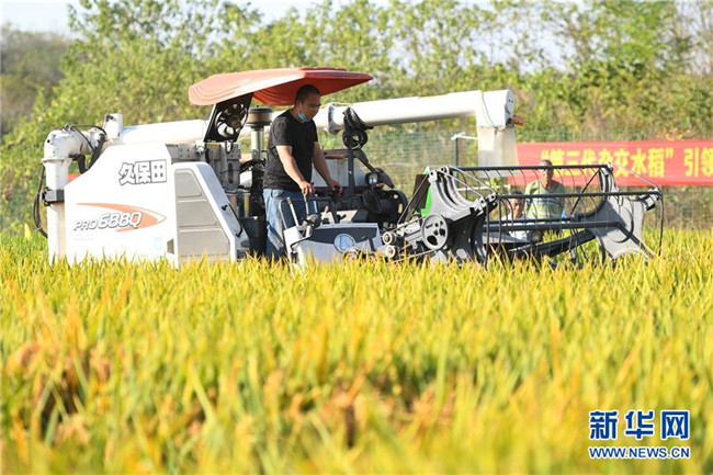 在第三代雜交水稻新組合試驗(yàn)示范衡南基地一塊被抽取測(cè)產(chǎn)的示范田里,工作人員進(jìn)行機(jī)械化收割測(cè)產(chǎn)(10月21日攝)。 新華社記者 陳澤國(guó) 攝