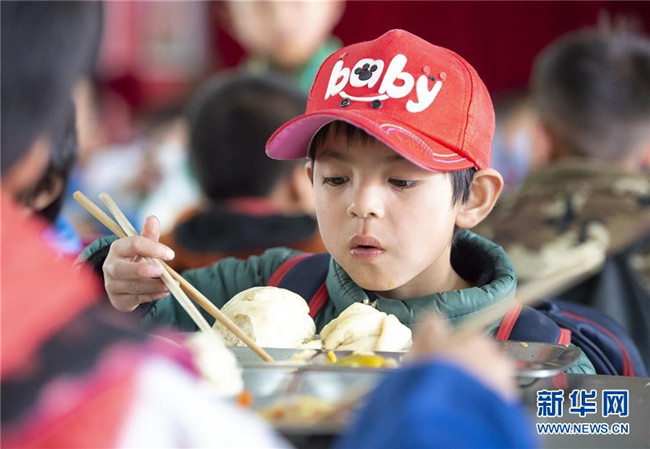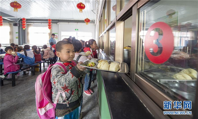 自實施農村義務教育學生營養(yǎng)改善計劃以來,寧夏回族自治區(qū)積極為農村學子提供免費的營養(yǎng)餐。從去年開始,寧夏固原市西吉縣的免費營養(yǎng)午餐迎來了升級換代,從原來的一道燴菜變成了如今的兩素一葷,餐具由餐桶換成了餐盤。在保證營養(yǎng)膳食搭配的同時,增加了學生的自主選擇性。從“吃得飽”到“吃得好”,升級換代的營養(yǎng)餐得到了廣大學生認可。 新華社發(fā)(楊植森 攝)