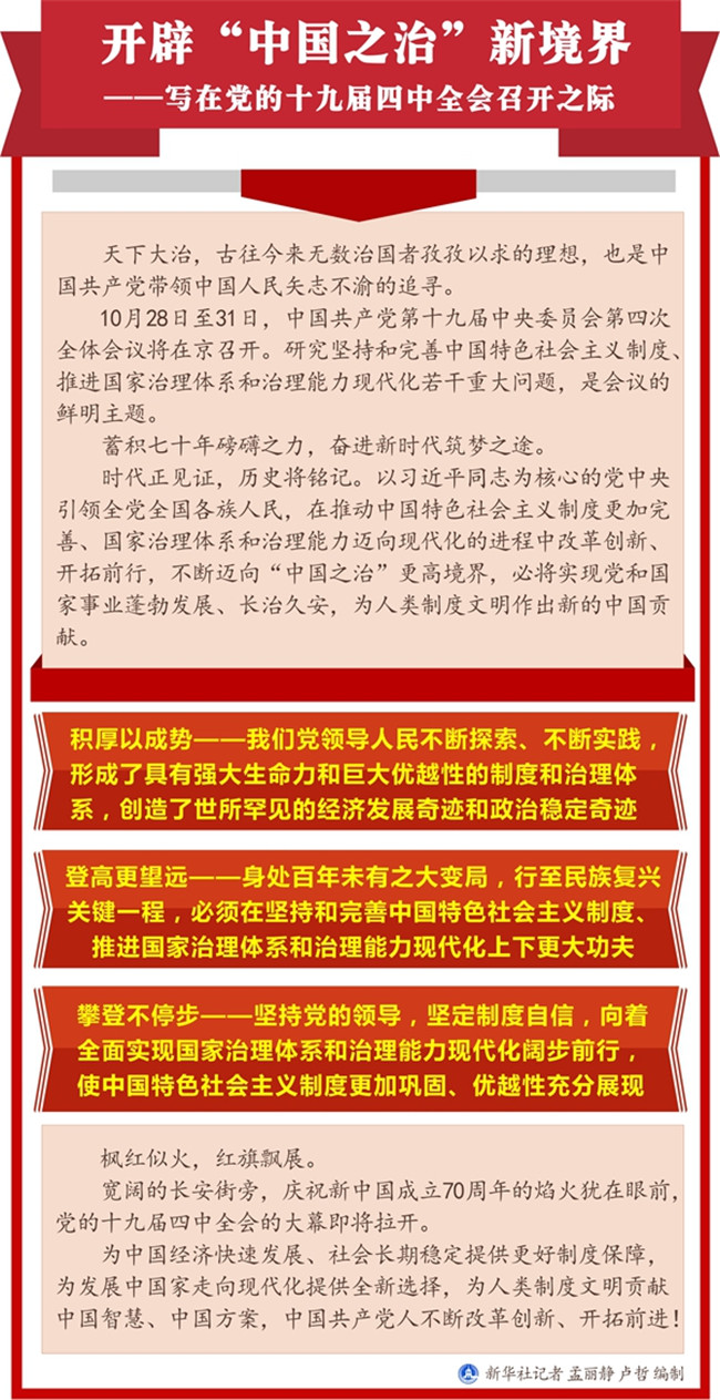 10月28日至31日,中國共產(chǎn)黨第十九屆中央委員會(huì)第四次全體會(huì)議將在京召開。研究堅(jiān)持和完善中國特色社會(huì)主義制度、推進(jìn)國家治理體系和治理能力現(xiàn)代化若干重大問題,是會(huì)議的鮮明主題。