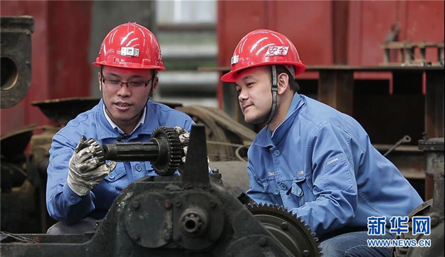 全國人大代表、山西焦煤西山煤電杜兒坪煤礦的董林(左)為職工講解設(shè)備構(gòu)造和傳動(dòng)原理(2018年4月25日攝)。新華社發(fā)
