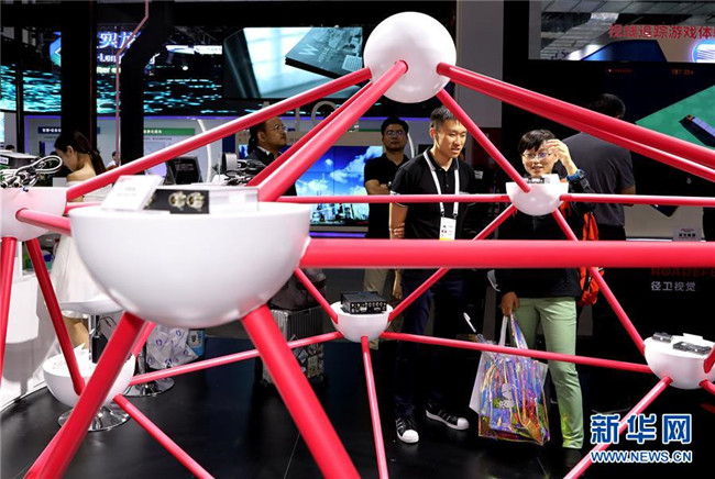 參觀者在上海舉行的2019世界人工智能大會上與一個智能機器人進行交流(8月29日攝)。新華社記者 方喆攝