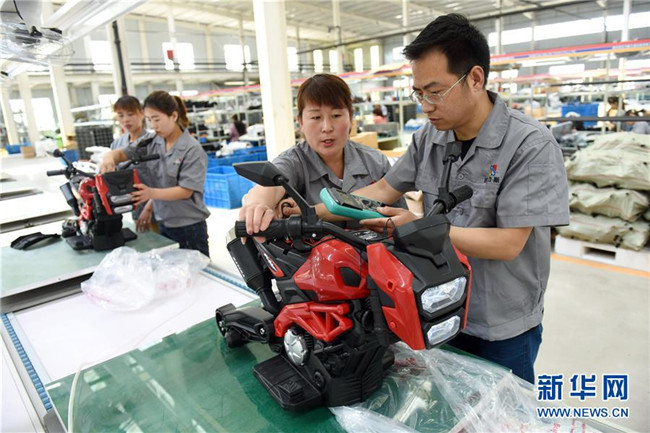 河北省邢臺經(jīng)濟(jì)開發(fā)區(qū)一家民營玩具生產(chǎn)企業(yè)的工人對產(chǎn)品進(jìn)行出廠檢測(5月29日攝)。新華社記者 朱旭東 攝