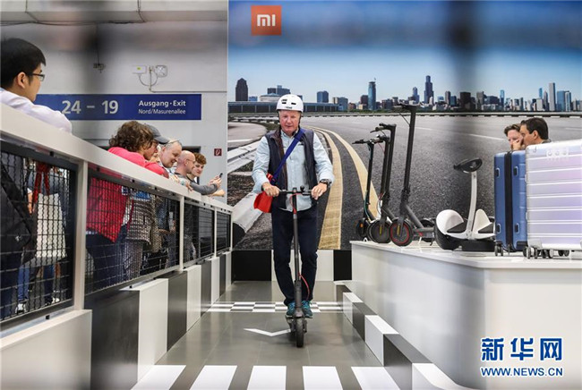 在德國首都柏林舉辦的第59屆柏林國際消費(fèi)電子展上,一名參觀者在小米公司展區(qū)體驗(yàn)電動(dòng)滑板車(9月6日攝)。新華社記者單宇琦攝