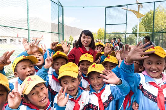 2019年10月21日,西藏自治區(qū)拉薩市曲水縣達(dá)嘎鄉(xiāng)其奴村,蘇明娟和“大眼睛希望小學(xué)”的學(xué)生們合影。