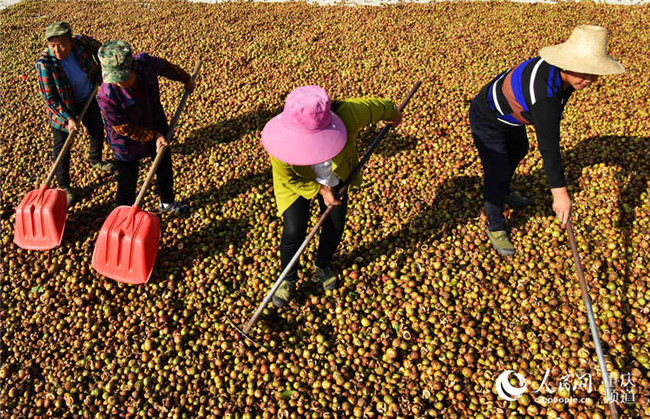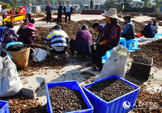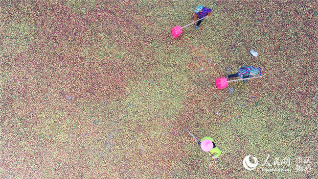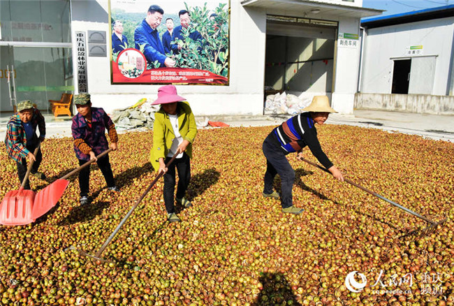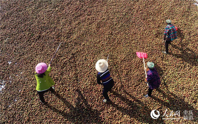 近日,重慶酉陽(yáng)萬(wàn)畝油茶喜獲豐收,工人們正忙著晾曬油茶籽。陳碧生攝近日,重慶酉陽(yáng)萬(wàn)畝油茶喜獲豐收,工人們正忙著晾曬油茶籽。陳碧生攝