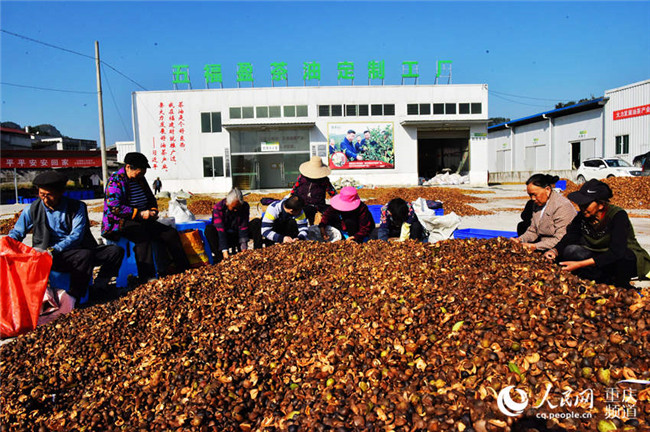 1月3日,在重慶市酉陽(yáng)土家族苗族自治縣五福鎮(zhèn)的五福盈茶油定制工廠,工人們正忙著晾曬油茶籽,整個(gè)廠區(qū)一片繁忙景象。近年來(lái),該縣采取“生態(tài)+產(chǎn)業(yè)”模式在荒山上開發(fā)的上萬(wàn)畝油茶已陸續(xù)豐收,油茶產(chǎn)業(yè)成為當(dāng)?shù)剞r(nóng)民脫貧致富產(chǎn)業(yè)之一。