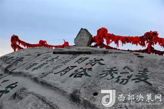 西峰為一塊完整巨石,渾然天成。西北絕崖千丈,似刀削鋸截,其陡峭巍峨、陽剛挺拔之勢是華山山形之代表,因此古人常把華山叫蓮花山。華山西峰就是《寶蓮燈》中沉香劈山救出三圣母的地方?,F(xiàn)在翠云宮邊上有一巨石中間裂開,如被斧劈,名“斧劈石”,旁邊還樹立一柄長把大斧。峰的西北面,直立如刀削,空絕萬丈,人稱舍身崖。峰上崖壁題刻遍布,工草隸篆,琳瑯滿目。峰北絕頂叫西石樓峰,峰上楊公塔為楊虎城將軍所建,塔上有楊虎城將軍親筆題辭。塔下巖石上有“枕破鴻蒙”題刻,是書法家王鐸手跡。