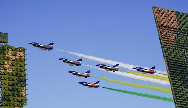 10月21日,在慶祝人民空軍成立70周年為主題的航空開放活動上,空軍八一飛行表演隊殲-10飛機編隊從靜態(tài)展示的新型雷達上空飛過。 萬全 攝