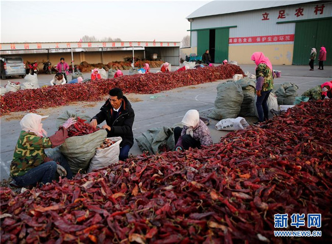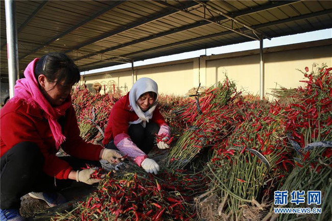 初冬時(shí)節(jié),甘肅省金昌市永昌縣水源鎮(zhèn)的村民們利用農(nóng)閑來(lái)到附近的辣椒加工廠打工,在家門(mén)口就業(yè)增收,每位村民每天可以增加100元左右的收入。