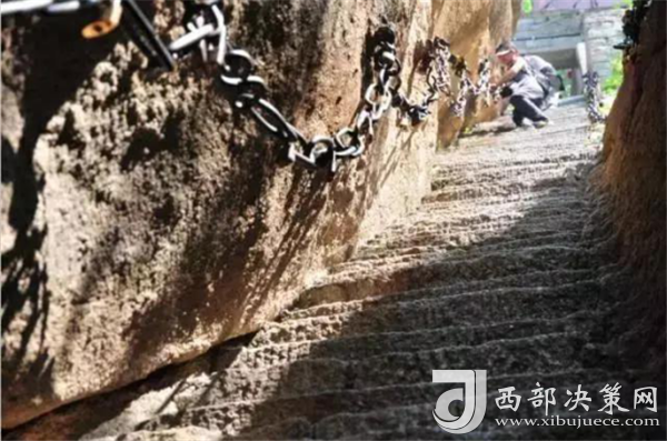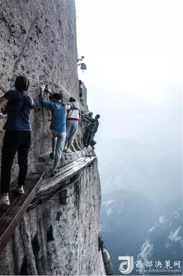 長(zhǎng)空棧道位于華山南峰東側(cè)山腰,是華山派第一代宗師元代高道賀志真為遠(yuǎn)離塵世靜修成仙,在萬仞絕壁上鑲嵌石釘搭木椽而筑。長(zhǎng)空棧道的盡頭便是思過崖。