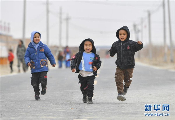 11月18日,幼兒園大班的小朋友放學(xué)后走在于田縣達里雅布依鄉(xiāng)易地扶貧搬遷安置點的硬化道路上。新華社記者胡虎虎攝