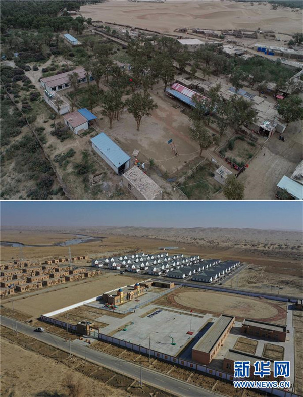 拼版照片:上圖為易地扶貧搬遷前的新疆于田縣達里雅布依鄉(xiāng)學(xué)校全景(2018年9月7日無人機拍攝);下圖為達里雅布依鄉(xiāng)易地扶貧搬遷安置點的學(xué)校新貌(2019年11月19日無人機拍攝)。新華社記者胡虎虎攝