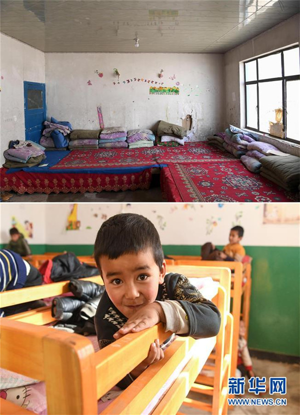 拼版照片:上圖為易地扶貧搬遷前的于田縣達里雅布依鄉(xiāng)學(xué)校學(xué)生宿舍(2018年9月5日攝);下圖為5歲的阿不都沙拉木·庫爾班在新學(xué)校午休(2019年11月19日攝)。新華社記者胡虎虎攝
