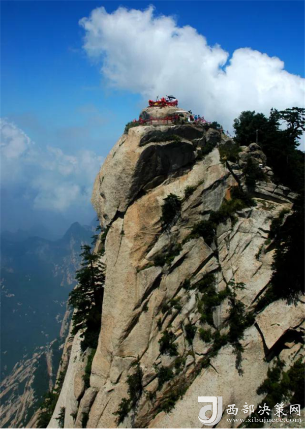 西峰又名蓮花峰,因翠云宮前有石如蓮瓣《山海經(jīng)》載,上有池生千葉蓮花,故稱蓮花峰,芙蓉峰。海拔2082.6米,蓮峰夕照,是西峰最壯麗的景色,每當(dāng)夕陽欲墜之際,満峰披霞鍍金,一派輝煌,真是“嶺背斜陽萬壑金”。西峰是華山最有觀賞價值的主峰之一,其峰勢險峻之驚人,傳說之動人,景觀之迷人,世所罕見。