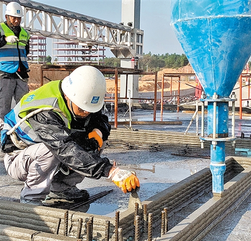 “工人可以趁著混凝土砂漿尚未凝固時在墻體底部開洞,為墻體內(nèi)的鋼筋籠與地基中的鋼筋焊接預(yù)留出空間。”中建二局廣東建設(shè)基地有限公司科技部副經(jīng)理黃云補(bǔ)充說,“手感像是切蛋糕,操作起來相當(dāng)方便”。