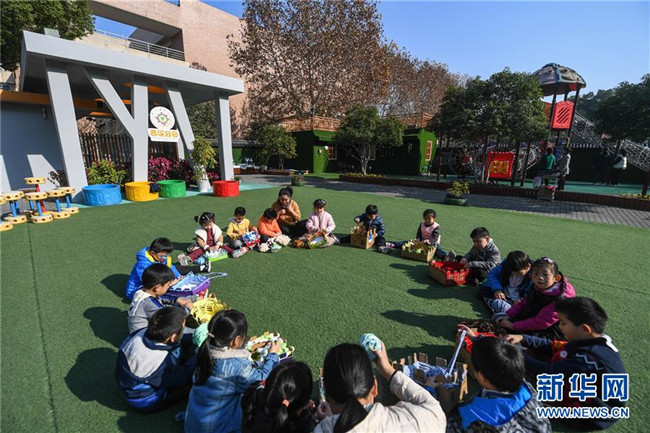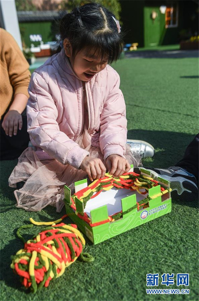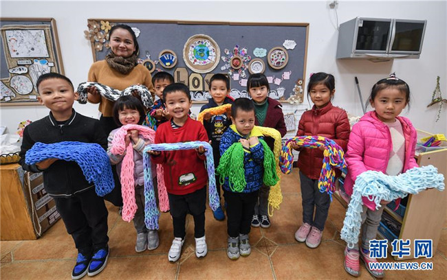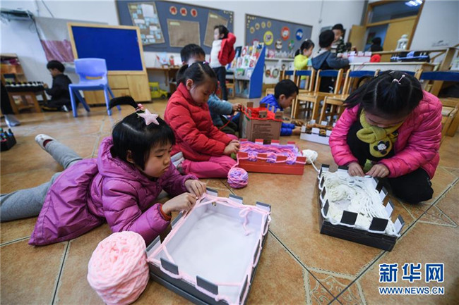 12月11日,小朋友們在老師的帶領下用紙盒制作的工具編織愛心圍巾。新華社記者 徐昱 攝
