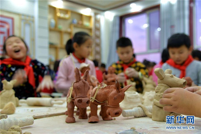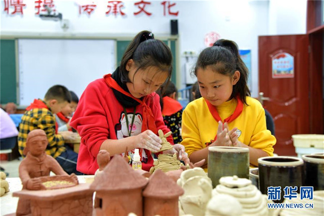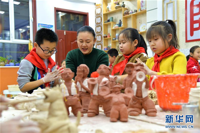 12月16日,清水河縣城關(guān)鎮(zhèn)第一小學(xué)學(xué)生在老師的指導(dǎo)下制作陶器。新華社記者 徐欽 攝