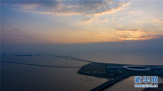 晨曦中的港珠澳大橋珠澳口岸人工島(10月24日無人機(jī)拍攝)。新華社記者 張金加 攝
