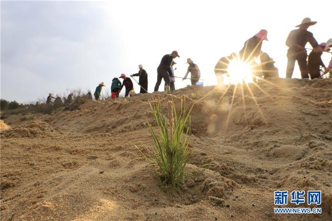 江西廬山市蓼南鄉(xiāng)組織村民在長江流域鄱陽湖畔的沙洲上種植瞿麥。瞿麥?zhǔn)且晃吨兴幉?,不僅有固沙綠化作用,還具有較高的經(jīng)濟價值(4月12日攝)。新華社發(fā)(韓俊烜 攝)