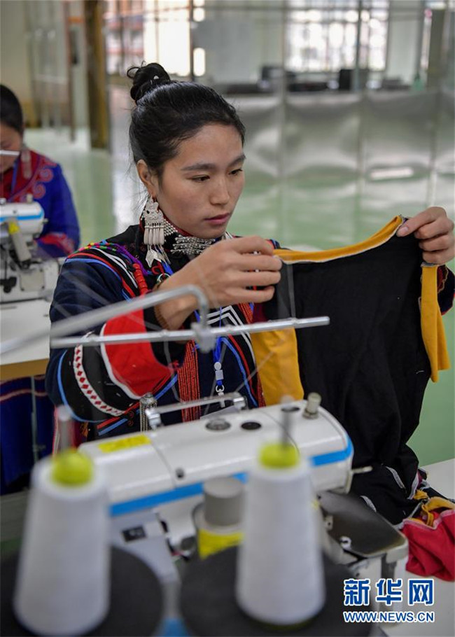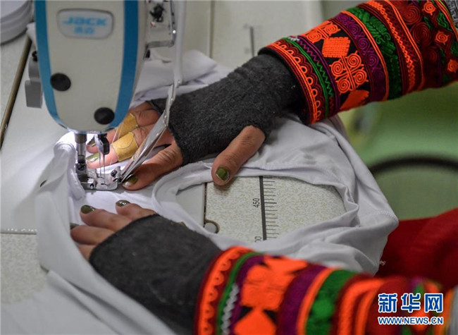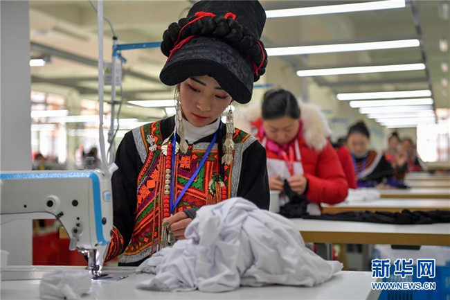 12月19日,一名身著彝族傳統(tǒng)服裝的女工在扶貧制衣車(chē)間工作。新華社記者 張超群 攝