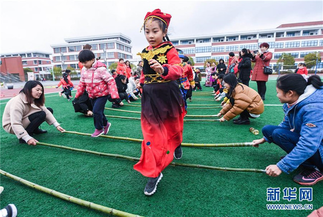 12月26日,身著少數(shù)民族服裝的孩子與同學(xué)們一起體驗(yàn)竹竿舞趣味活動。當(dāng)日,浙江省長興縣李家巷鎮(zhèn)中心幼兒園舉辦“炫彩民族風(fēng)歡樂來運(yùn)動”為主題的趣味民族游戲活動。該幼兒園有一些孩子來自壯族、苗族、布依族等少數(shù)民族。幼兒園旨在通過這種活動,讓孩子們和家長共同體驗(yàn)竹竿舞、篝火舞、擲糠包等少數(shù)民族特色游戲,了解少數(shù)民族特色文化。新華社記者徐昱攝