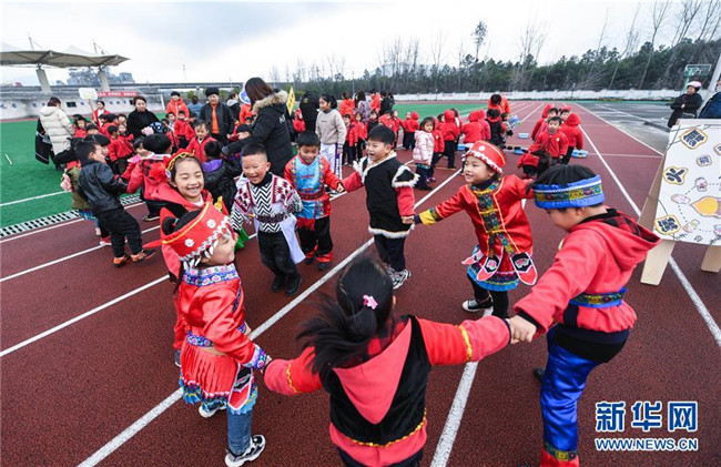 12月26日,孩子們在參加跳花繩活動。當(dāng)日,浙江省長興縣李家巷鎮(zhèn)中心幼兒園舉辦“炫彩民族風(fēng)歡樂來運(yùn)動”為主題的趣味民族游戲活動。該幼兒園有一些孩子來自壯族、苗族、布依族等少數(shù)民族。幼兒園旨在通過這種活動,讓孩子們和家長共同體驗(yàn)竹竿舞、篝火舞、擲糠包等少數(shù)民族特色游戲,了解少數(shù)民族特色文化。新華社記者徐昱攝