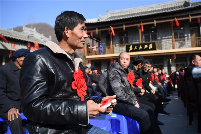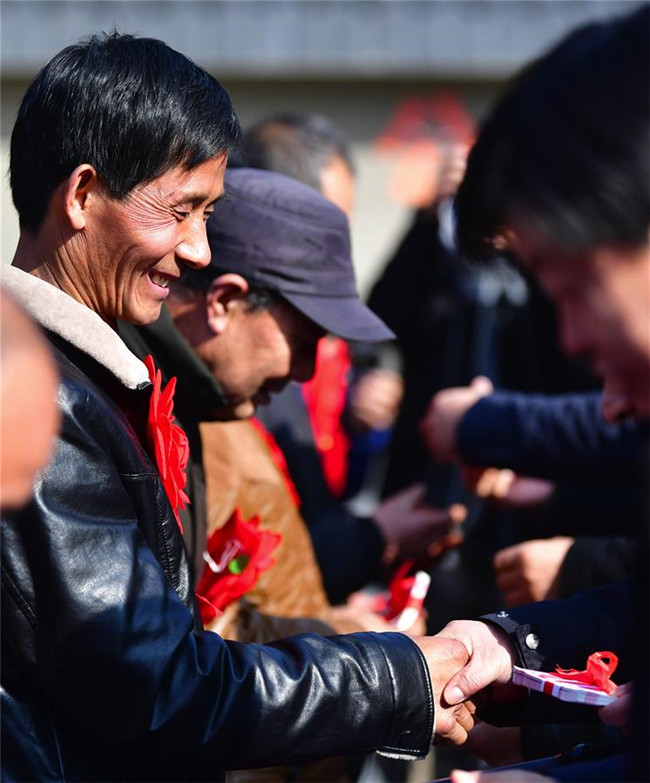 1月7日,村民康耀林在分紅大會上領(lǐng)到自己的分紅。 新華社記者 陳斌 攝