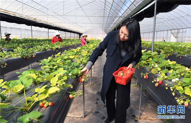 1月9日,游客在云南省富民縣散旦鎮(zhèn)漢營(yíng)村草莓種植基地采摘。 新華社記者楊宗友攝
