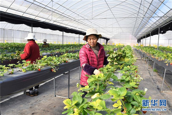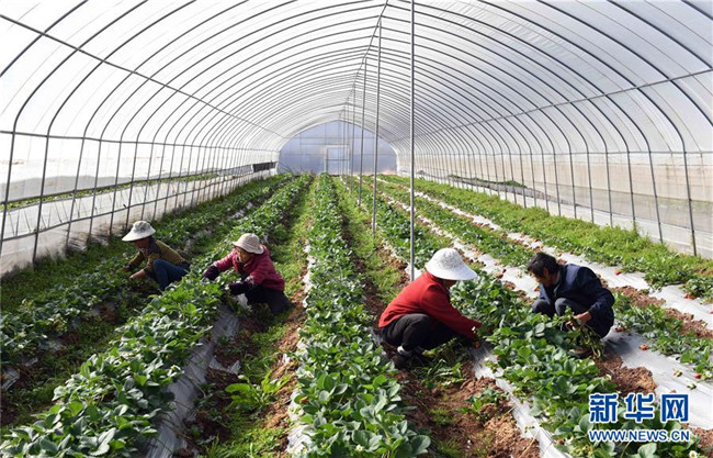 1月9日,云南省富民縣散旦鎮(zhèn)漢營(yíng)村農(nóng)民在草莓種植基地除草。 新華社記者楊宗友攝