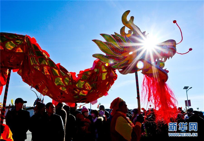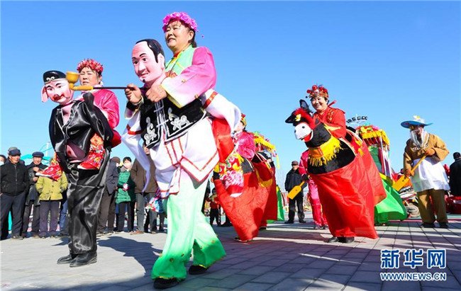 1月13日,甘肅張掖甘州區(qū)靖安鎮(zhèn)的社火表演隊(duì)在文化廣場(chǎng)上排練。