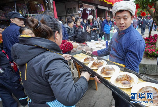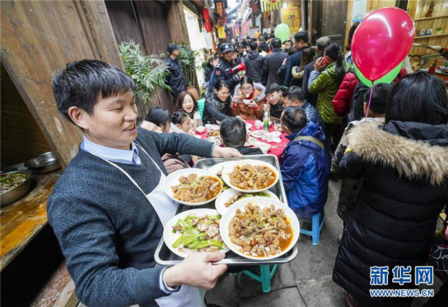 1月18日,一名中山古鎮(zhèn)的居民給體驗“千米長宴”的游客上菜。當(dāng)日中午,伴隨著一聲“開席嘍”,一年一度的“千米長宴”在重慶市江津區(qū)中山古鎮(zhèn)舉行。噴香的煙熏豆腐、軟糯的夾燒肉、可口的石板糍粑……800余桌年味十足的特色美食,吸引了兩萬多名游客前來體驗傳統(tǒng)民俗,感受“一雙筷子吃遍一條街”的暢快淋漓。中山古鎮(zhèn)自古就有“千米匯長宴萬人祈福祉”的習(xí)俗。每年春節(jié)期間,古鎮(zhèn)老街居民都會在千米長街上大擺“百家宴”,祝福生意興隆、家業(yè)興旺、風(fēng)調(diào)雨順、五谷豐登。新華社記者劉潺攝