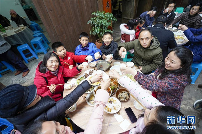 1月18日,游客在中山古鎮(zhèn)老街上體驗“千米長宴”傳統(tǒng)美食。當(dāng)日中午,伴隨著一聲“開席嘍”,一年一度的“千米長宴”在重慶市江津區(qū)中山古鎮(zhèn)舉行。噴香的煙熏豆腐、軟糯的夾燒肉、可口的石板糍粑……800余桌年味十足的特色美食,吸引了兩萬多名游客前來體驗傳統(tǒng)民俗,感受“一雙筷子吃遍一條街”的暢快淋漓。中山古鎮(zhèn)自古就有“千米匯長宴萬人祈福祉”的習(xí)俗。每年春節(jié)期間,古鎮(zhèn)老街居民都會在千米長街上大擺“百家宴”,祝福生意興隆、家業(yè)興旺、風(fēng)調(diào)雨順、五谷豐登。新華社記者劉潺攝