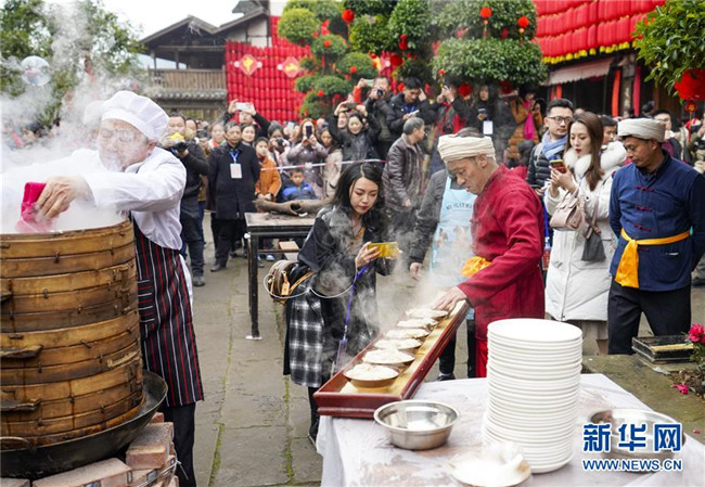 1月18日,在中山古鎮(zhèn)的“千米長宴”上,民間藝人用古鎮(zhèn)傳統(tǒng)“打盆”絕藝給游客們上菜。當(dāng)日中午,伴隨著一聲“開席嘍”,一年一度的“千米長宴”在重慶市江津區(qū)中山古鎮(zhèn)舉行。噴香的煙熏豆腐、軟糯的夾燒肉、可口的石板糍粑……800余桌年味十足的特色美食,吸引了兩萬多名游客前來體驗傳統(tǒng)民俗,感受“一雙筷子吃遍一條街”的暢快淋漓。中山古鎮(zhèn)自古就有“千米匯長宴萬人祈福祉”的習(xí)俗。每年春節(jié)期間,古鎮(zhèn)老街居民都會在千米長街上大擺“百家宴”,祝福生意興隆、家業(yè)興旺、風(fēng)調(diào)雨順、五谷豐登。新華社記者劉潺攝