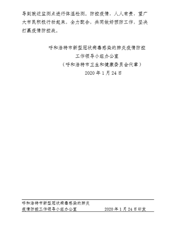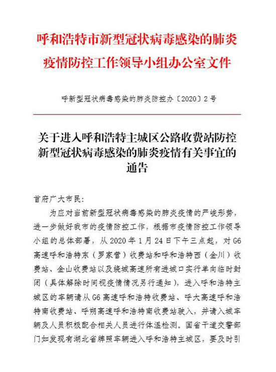 記者從呼和浩特市新型冠狀病毒感染的肺炎疫情防控工作領(lǐng)導小組辦公室獲悉,為應(yīng)對當前新型冠狀病毒感染的肺炎疫情的嚴峻形勢,進一步做好呼和浩特市的疫情防控工作。從2020年1月24日下午三點起,對G6高速呼和浩特東(羅家營)收費站和呼和浩特西(金川)收費站、金山收費站以及繞城高速所有進城口實行單向臨時封閉(具體解除時間視疫情情況另行通知)。進入呼和浩特主城區(qū)的車輛請從G6高速呼和浩特收費站、呼大高速呼和浩特南收費站、呼朔高速呼和浩特南收費站駛?cè)?,并請入城車輛及人員積極配合相關(guān)人員進行體溫檢測。