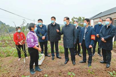 春回大地,正是春耕好時節(jié)。黎明村村民搶抓農(nóng)時,有的在翻耕土地,有的正給田間作物澆水施肥,有的在播種早春玉米,一片忙碌景象。彭清華走進村口的花椒基地,與套種茄子秧苗的村民親切交談,詢問栽種面積、土壤墑情、生長周期、市場銷路等情況。他說,一年之計在于春,切實抓好春耕生產(chǎn)對于實現(xiàn)全年豐產(chǎn)豐收意義重大。農(nóng)時不等人,要在嚴(yán)格落實防控措施的同時,及時推進春季農(nóng)業(yè)生產(chǎn)和生豬恢復(fù)生產(chǎn),因地制宜調(diào)整種養(yǎng)業(yè)結(jié)構(gòu),確保穩(wěn)產(chǎn)保供和農(nóng)民持續(xù)增收。有關(guān)部門要繼續(xù)做好服務(wù)保障,加強技術(shù)指導(dǎo),強化農(nóng)資儲備、調(diào)劑和配送,搞好產(chǎn)銷銜接,讓生產(chǎn)資料進得來、農(nóng)產(chǎn)品賣得出。對隔離觀察群眾要做好生產(chǎn)扶持工作,幫助他們克服困難、不誤農(nóng)時。