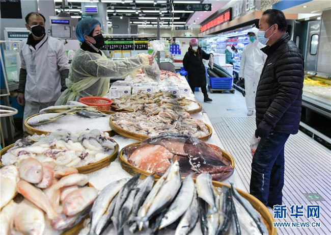 2月10日,顧客在湖北省武漢市江漢區(qū)中百倉儲超市北湖購物廣場店選購水產(chǎn)。新華社記者 李賀 攝
