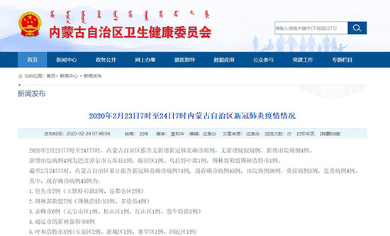 人民網(wǎng)呼和浩特2月24日電 (陳立庚)2月24日,記者從內蒙古自治區(qū)衛(wèi)生健康委員會獲悉,2020年2月23日7時至24日7時,內蒙古自治區(qū)報告無新增新冠肺炎確診病例,無新增疑似病例,新增出院病例4例。