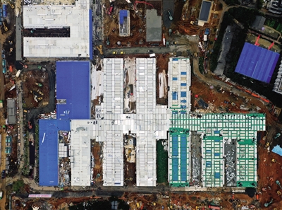 在武漢火神山、雷神山醫(yī)院建設(shè)中,基于北斗衛(wèi)星導(dǎo)航系統(tǒng)的高精度定位設(shè)備火速馳援,確保工地大部分放線測(cè)量一次完成。這是無人機(jī)拍攝的武漢火神山醫(yī)院。記者 李賀 攝