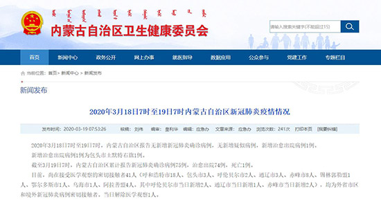 截至3月19日7時,內(nèi)蒙古自治區(qū)累計(jì)報告新冠肺炎確診病例75例,治愈出院74例,死亡1例。